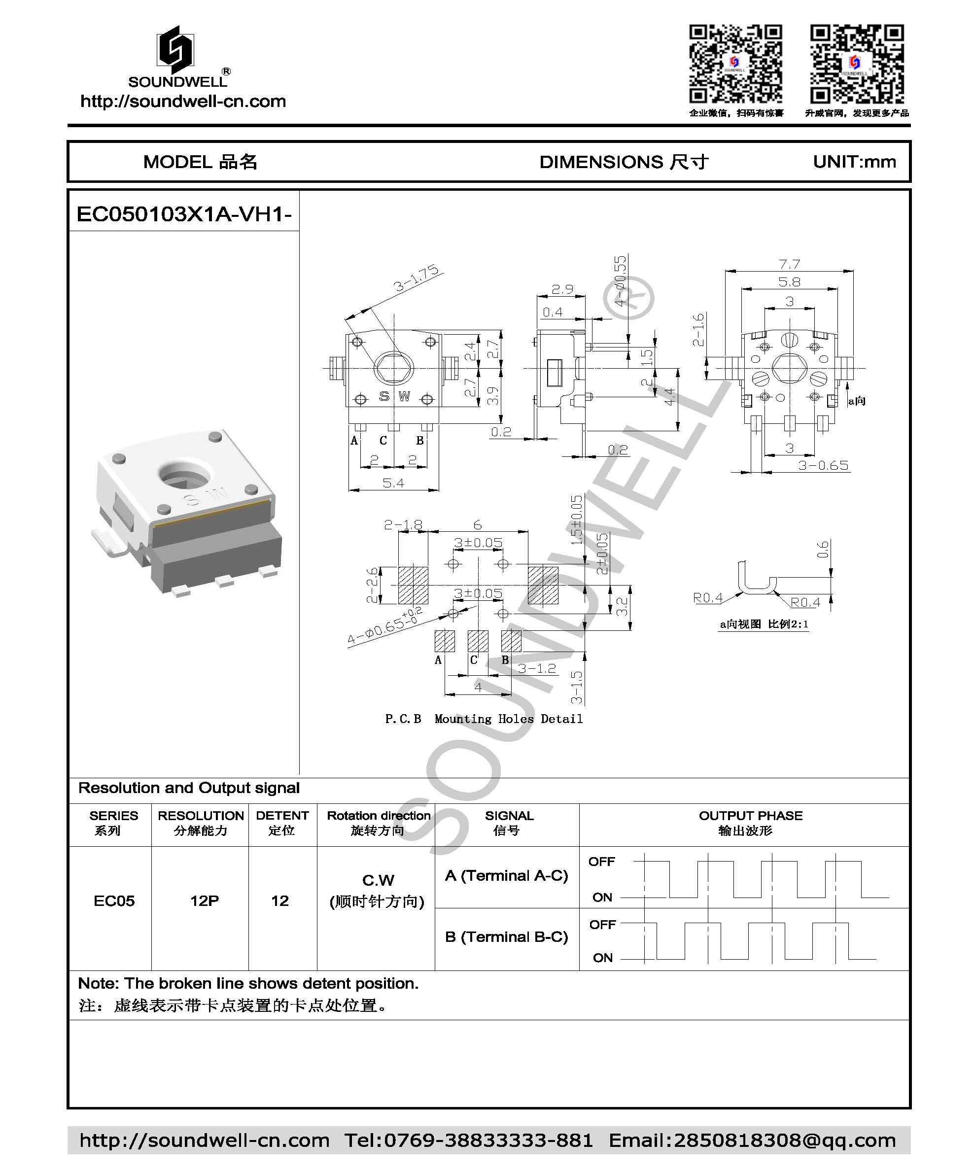 Rated voltage: DC 5V Number of detent: 18 Pulses: 9 Rotational torque: 5-30 gf.cm. Working temperature: -40℃~85℃; Rotational life: 30,000 cycles Min; |
