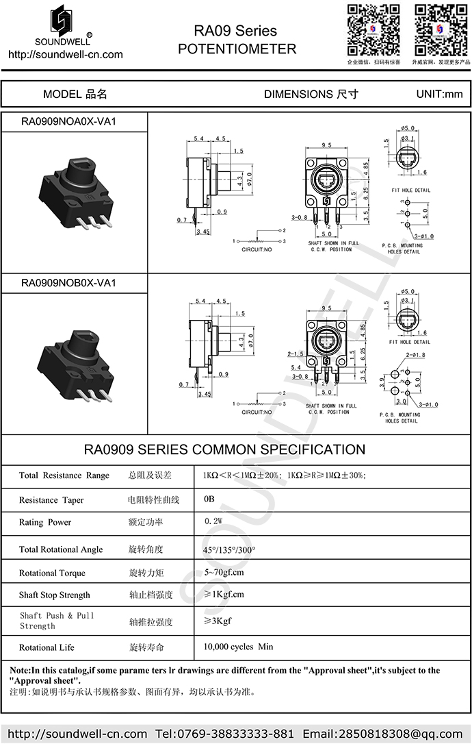 | Main Specifications: | Total resistance error: ±20% Full rotation angle: 280±10°/300±10° Rated power: 0.05W Operating temperature: -10°C~60°C Rotational life: 10,000 cycles Min |