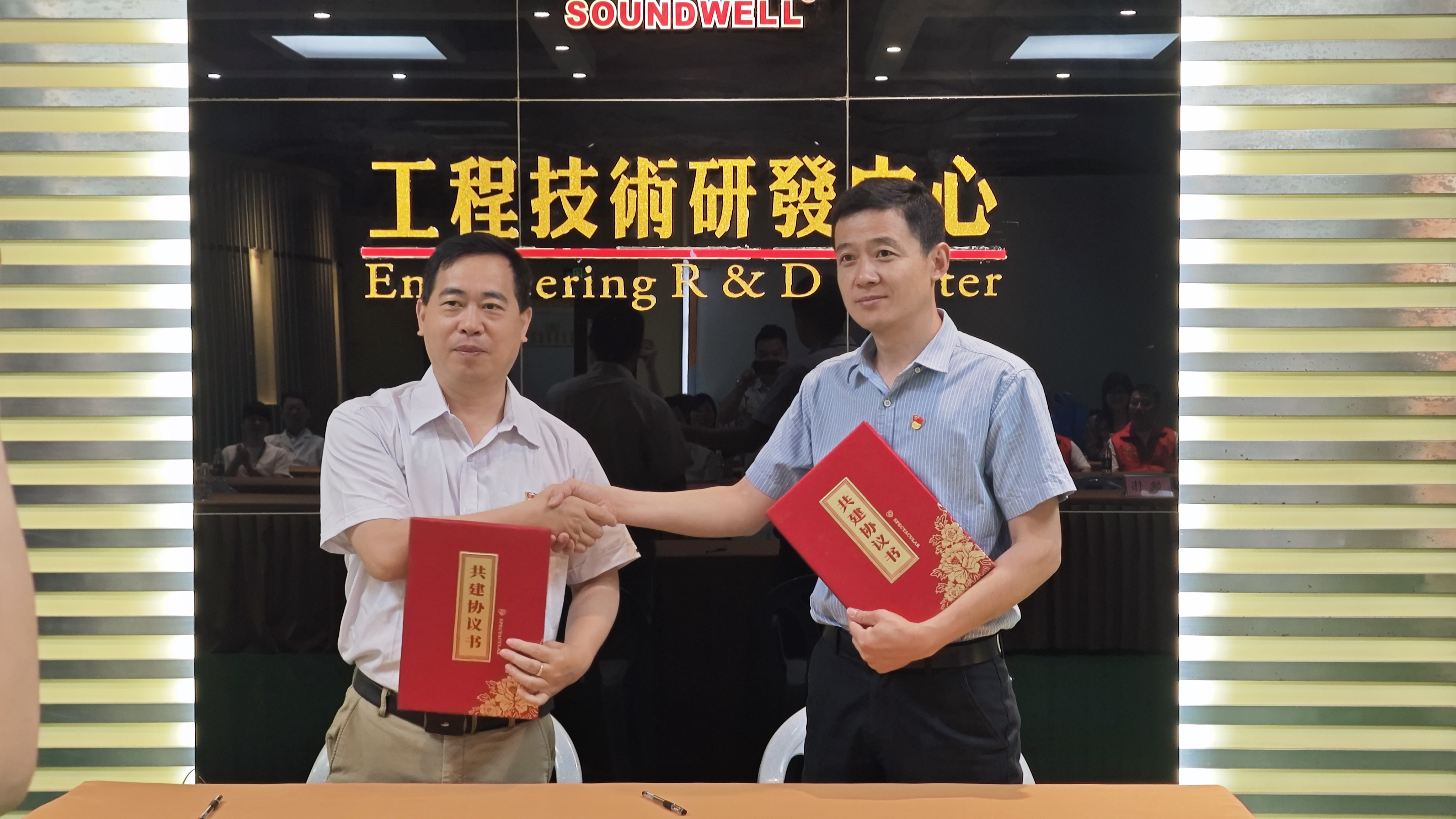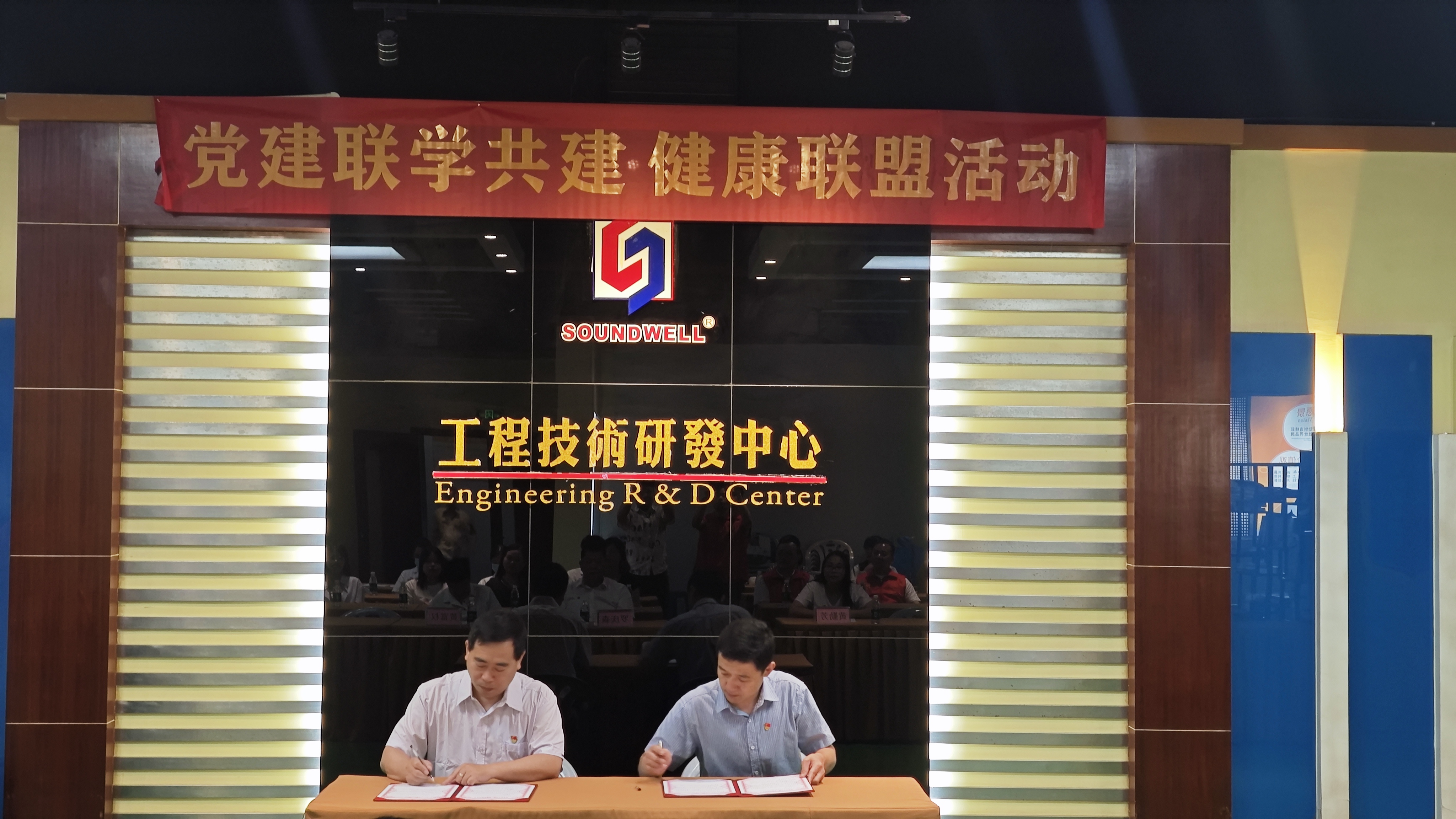 廣東升威電子有限公司代表彭明亮?xí)?、莞華醫(yī)院代表姚偉書記上臺(tái)簽訂《黨建聯(lián)學(xué)共建、健康聯(lián)盟協(xié)議書》。