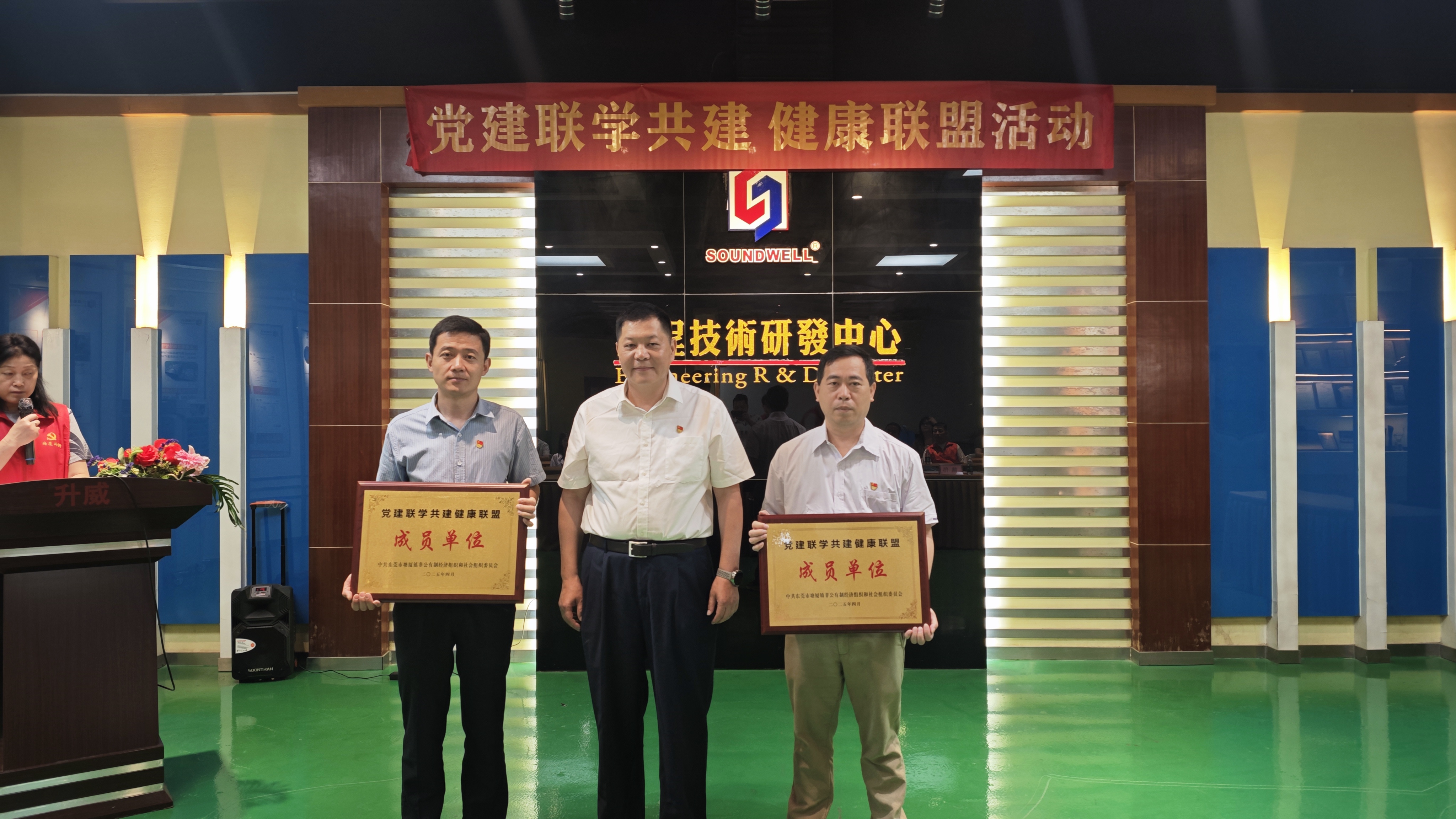 塘廈鎮(zhèn)“兩新”組織黨委副書記羅慶森為莞華醫(yī)院、升威電子頒發(fā)黨建聯(lián)學(xué)共建、健康聯(lián)盟牌匾。